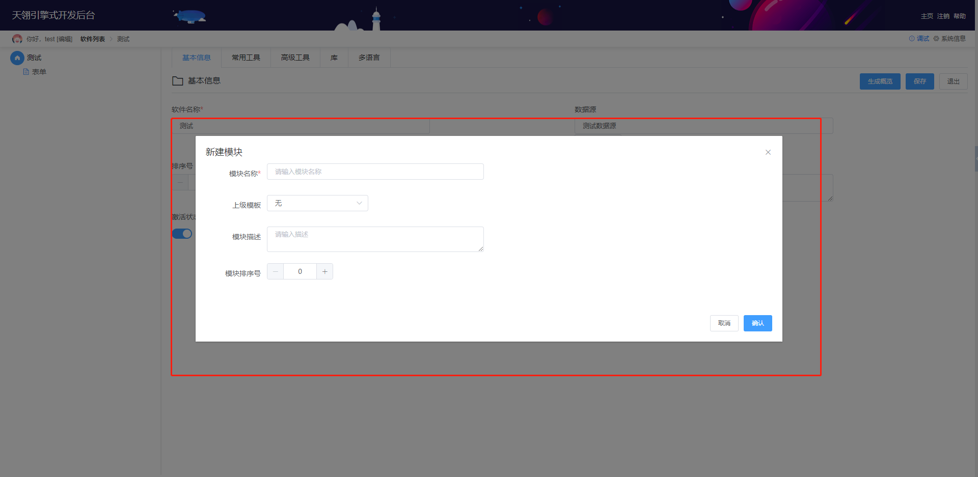 基本信息:模块名称,上级模块,模块描述,模块排序号。