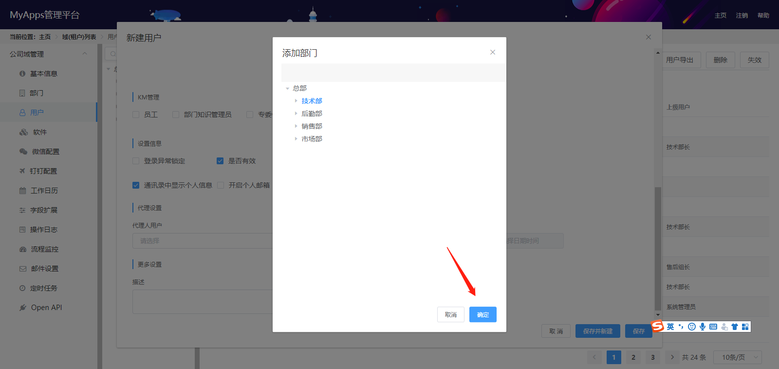 第五步:设置部门权限,设置后用户可以在前台进入企业域对自己的部门、用户进行操作。