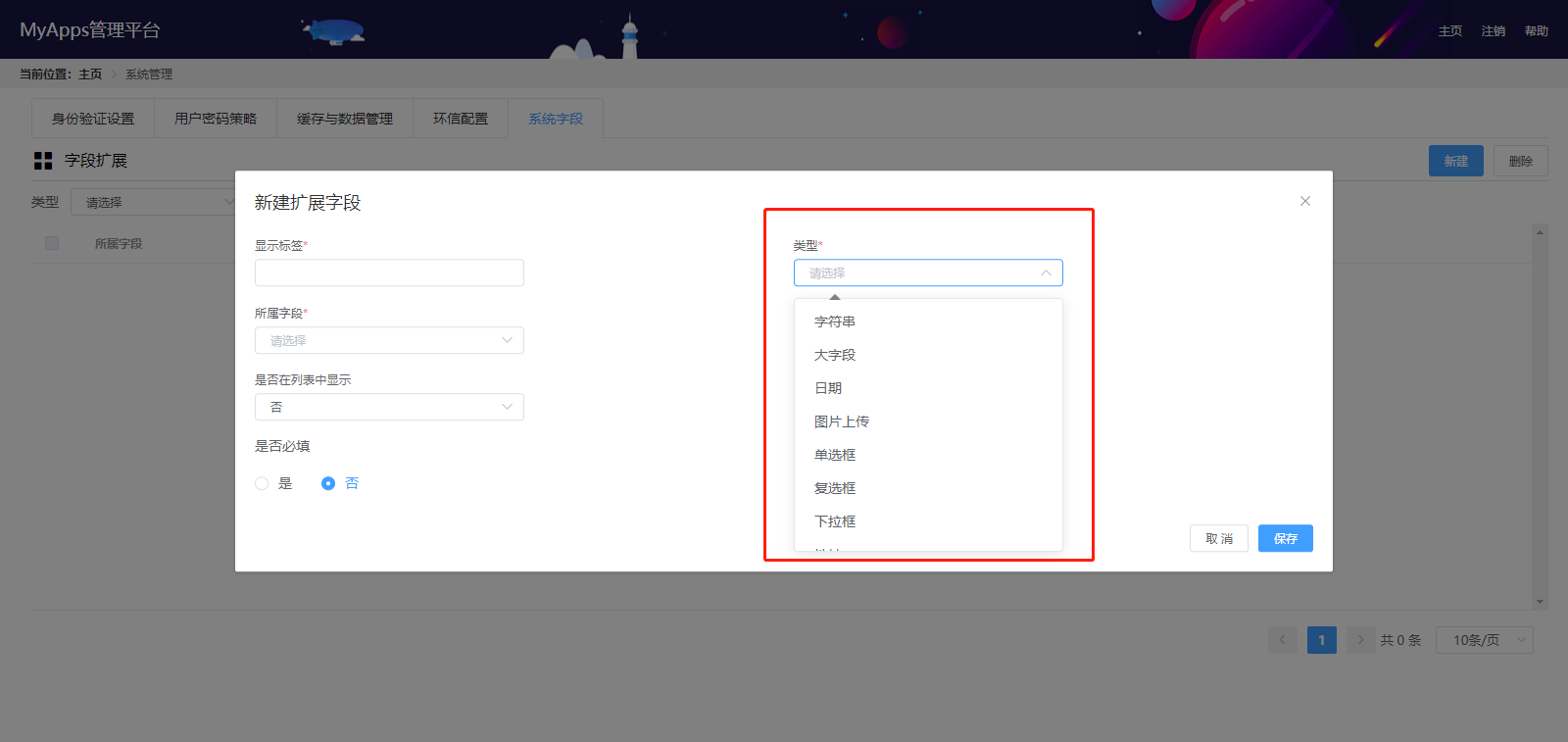 第一步:切换至【系统字段】操作界面,点击新建按钮添加扩展字段;
