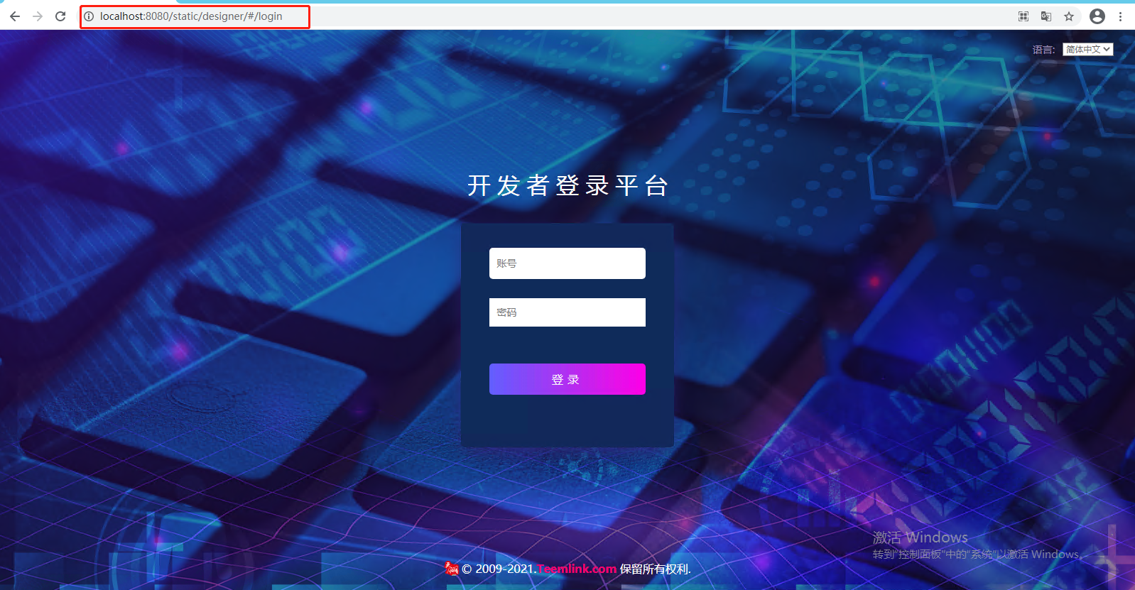 第七步:登录后台软件管理;(地址:http://localhost:8080/designer ,帐号/密码:admin/teemlink)